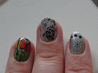 Today I want to show you a post I recently did using advanced stamping. As a base for this manicure I used Ruby Kisses - Silver Bling. On most of my nails I stamped on different black flower motives, but unfortunately most parts didn't transfer well. At first I wasn't sure if I should share this with you at all, but I like the accent nail so much I decided to go through with it.