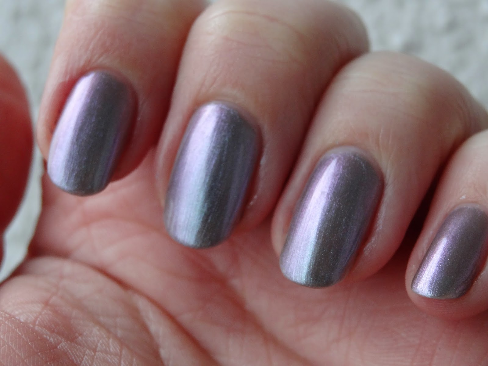 Today I want to show you my first duochrome nailpolish from LOOK by Bipa - special effect - green-purple (Nr.5). It has a greyish silver base and shimmers in green and purple. I took quite a lot of pictures to capture the colours. The formula was very good and application easy with hardly any cleanup and dried very fast to a metallic finish. It is very sheer though and after two coats there was still a VNL. In this case it didn't matter, because I wanted to layer another polish over it (OPI - Metallic 4 Life) which I shared with you a few days ago.